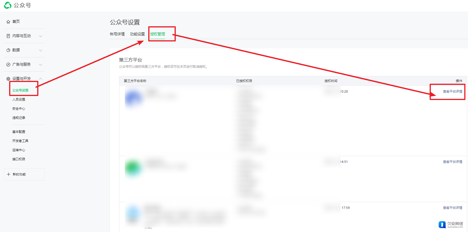 微信公众平台https://mp.weixin.qq.com 登录到公众号后台,在【设置与开发-公众号设置-授权管理】中找到对应要取消授权的公众号,点击【查看平台详情】。如下图: