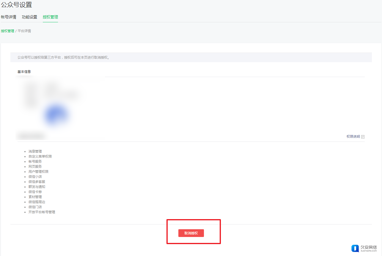 点击“取消授权”按钮即可完成解除微信公众号服务授权操作。