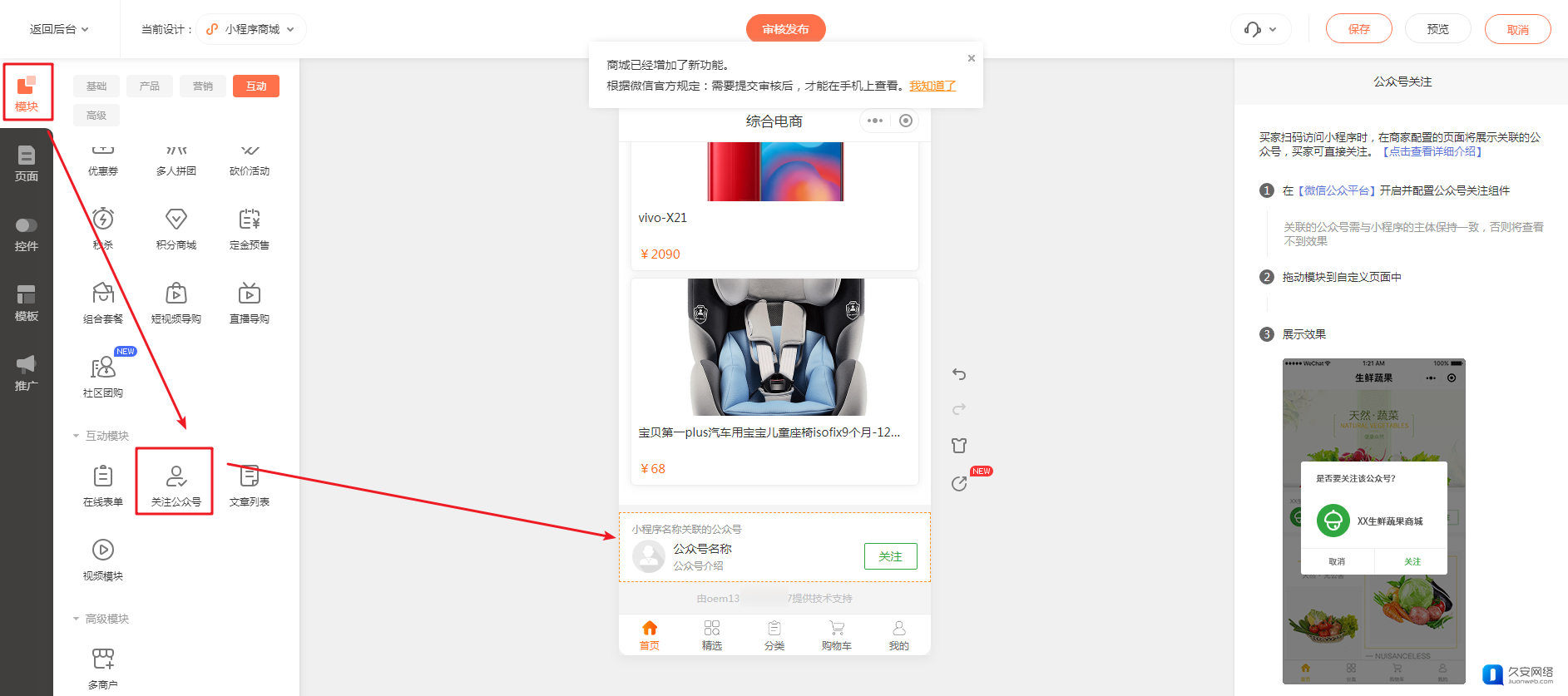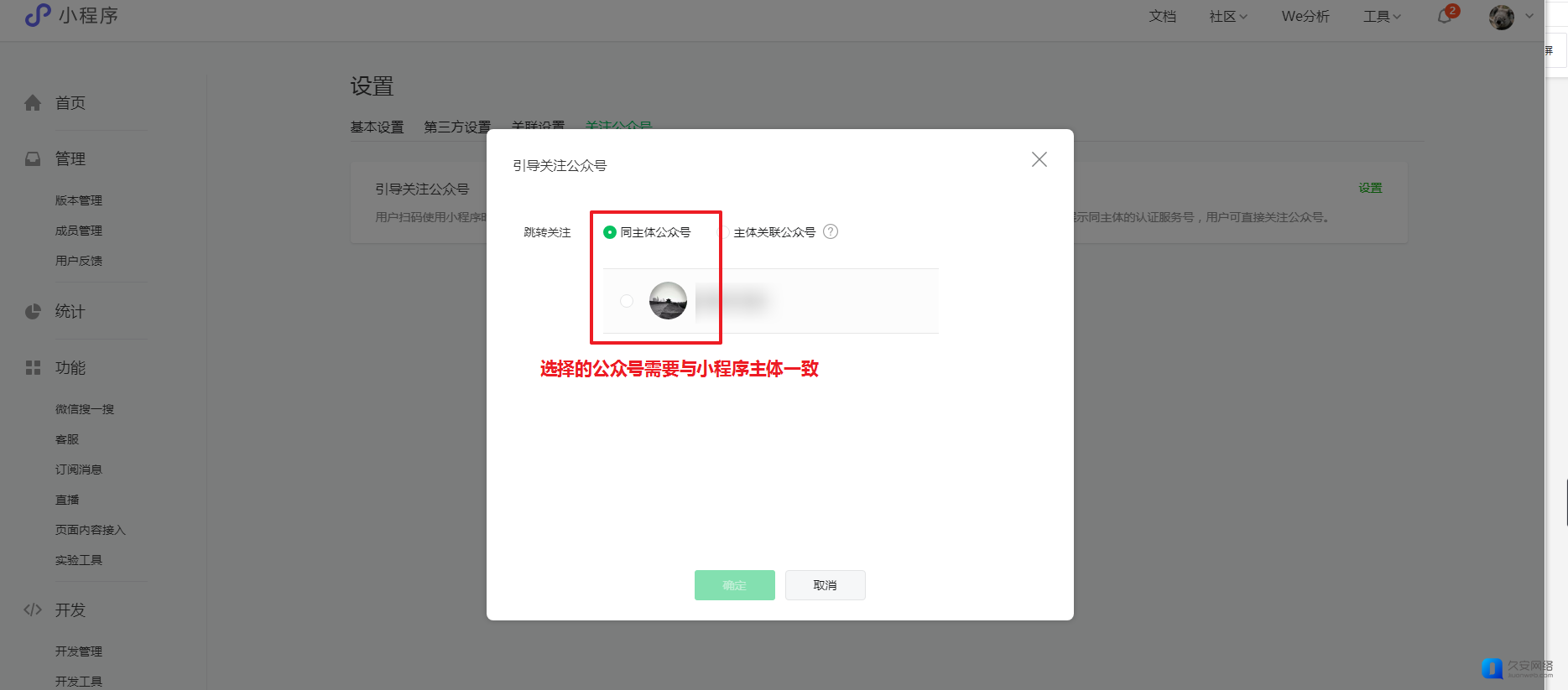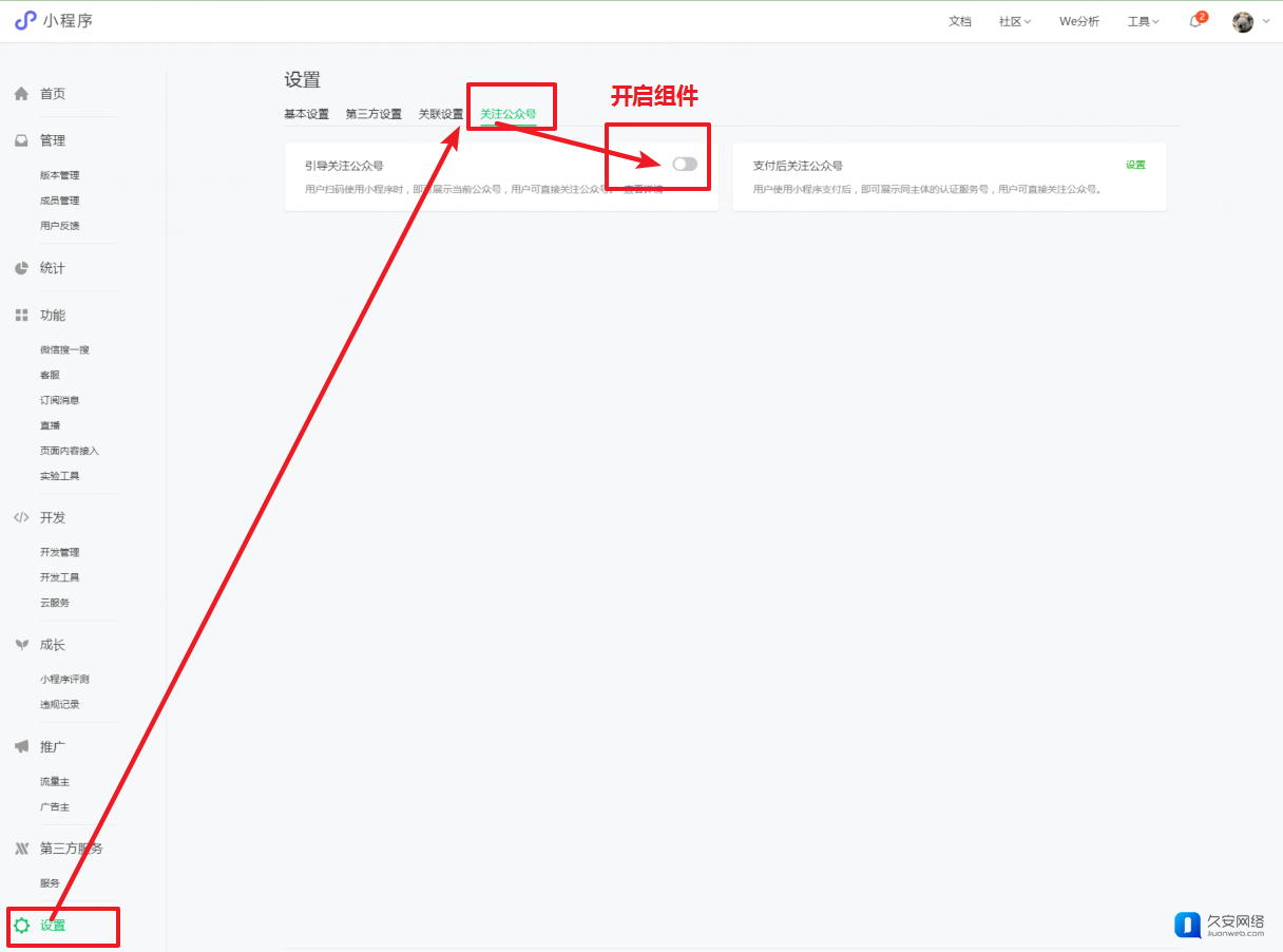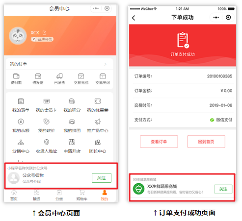 一、功能介绍 如今,微信小程序的兴起,使得大多数商家都拥有了企业的小程序,可是大多数商家都是不知道小程序上是可以直接点击关注公众号的,如此好的分流效果却被忽视了! 其实,通过设置后,当访客通过手机扫一扫访问小程序时,就可以看到“公众号关注”的组件,点击即可直接关注商家公众号。如此以来,“公众号关注”的功能可以为商家公众号引流,往后商家可以通过内容运营更好地留住顾客,大幅度提升企业的流量! 二、功能说明 【版本】设置无版本要求,发布要求商城付费版 【适用】小程序 【注意事项】 ①微信规定,只有当访客通过微信扫一扫的方式访问小程序时,才能看到关注公众号组件。 ②关联的公众号需与小程序的主体保持一致,否则将查看不到效果。 ③ 一个栏目页面只能添加一个“公众号关注”组件。 三、设置教程 1. 公众号关联小程序 注意:公众号和小程序都在同一个登录链接进行登录,注意区分账号! 1.1 公众号关联系小程序 ① 登录微信公众平台”小程序的后台“【开发】➡【开发设置】➡【开发者ID】,先获取小程序appid。 如下操作即可获得小程序appid。 ② 登录微信公众平台”公众号后台“(建议用另外一个浏览器登录)左侧导航栏中,选择【小程序】后进入【小程序管理】中,然后点击【添加】按钮。 ③ 在微信公众平台的”公众号后台“弹窗中点击【关联小程序】,输入需要关联小程序的appid,发送关联邀请,等待小程序管理员在微信中确认即可。 2. 开启/设置小程序的公众号关注组件 ① 成功关联公众号和小程序后,进入微信公众平台的小程序后台【设置】--【关注公众号】,开启【公众号关注组件】。 ② 扫码验证后选择与当前小程序的主体信息一致的公众号,点击【确认】即可完成操作。 2. 展示关注公众号 登录商城网站账号后,进入【商城管理】后台系统,选择【小程序商城】。 2.1 关注公众号模块 ① 在商城小程序设计页面点击【模块-关注公众号】,添加关注公众号模块后保存。 ② 当访客使用手机微信扫一扫的方式访问小程序时,就可以看到公众号关注的模块,如下图。 若访客已经关注了公众号,则公众号关注组件上“关注”按钮会显示为“查看”。 2.2 系统页面显示关注公众号组件 ① 在商城小程序设计页面点击【推广-关注公众号】,在右边弹窗中勾选【订单支付成功页面】和【会员中心页面】即可。 ② 效果示例 温馨提示: ① 需要关注的公众号,须在微信公众号后台先关联该小程序。 ② 切记一定要去微信小程序后台开启“公众号关注组件”。并且只能关注同一主体的公众号。