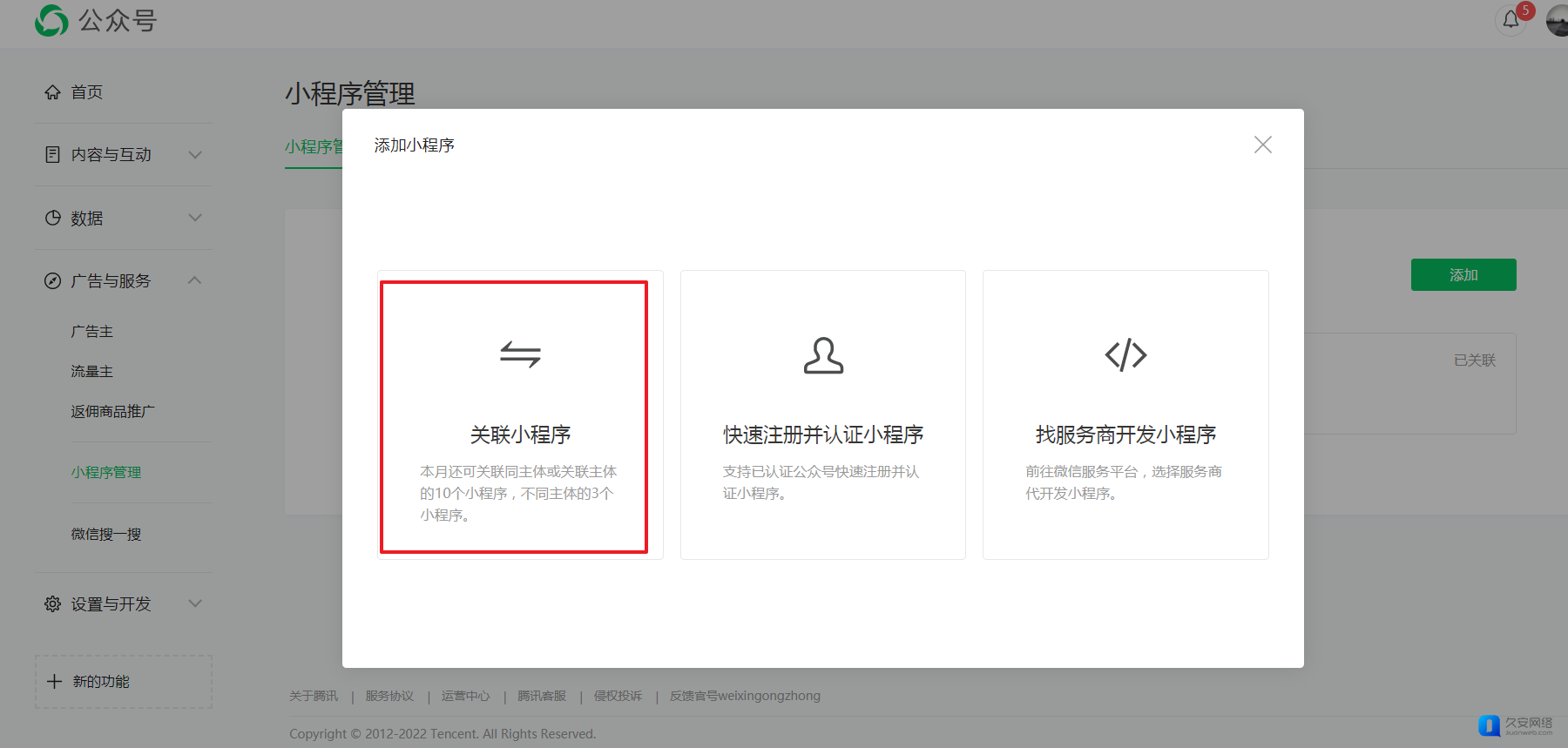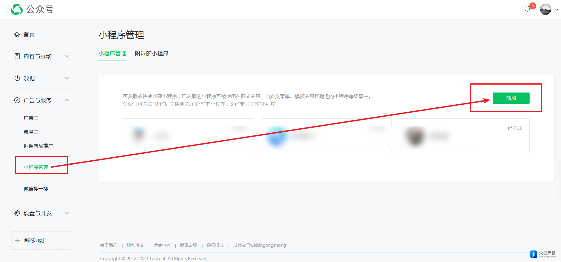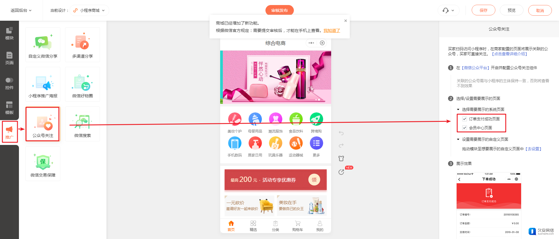 一、功能介绍 如今,微信小程序的兴起,使得大多数商家都拥有了企业的小程序,可是大多数商家都是不知道小程序上是可以直接点击关注公众号的,如此好的分流效果却被忽视了! 其实,通过设置后,当访客通过手机扫一扫访问小程序时,就可以看到“公众号关注”的组件,点击即可直接关注商家公众号。如此以来,“公众号关注”的功能可以为商家公众号引流,往后商家可以通过内容运营更好地留住顾客,大幅度提升企业的流量! 二、功能说明 【版本】设置无版本要求,发布要求商城付费版 【适用】小程序 【注意事项】 ①微信规定,只有当访客通过微信扫一扫的方式访问小程序时,才能看到关注公众号组件。 ②关联的公众号需与小程序的主体保持一致,否则将查看不到效果。 ③ 一个栏目页面只能添加一个“公众号关注”组件。 三、设置教程 1. 公众号关联小程序 注意:公众号和小程序都在同一个登录链接进行登录,注意区分账号! 1.1 公众号关联系小程序 ① 登录微信公众平台”小程序的后台“【开发】➡【开发设置】➡【开发者ID】,先获取小程序appid。 如下操作即可获得小程序appid。 ② 登录微信公众平台”公众号后台“(建议用另外一个浏览器登录)左侧导航栏中,选择【小程序】后进入【小程序管理】中,然后点击【添加】按钮。 ③ 在微信公众平台的”公众号后台“弹窗中点击【关联小程序】,输入需要关联小程序的appid,发送关联邀请,等待小程序管理员在微信中确认即可。 2. 开启/设置小程序的公众号关注组件 ① 成功关联公众号和小程序后,进入微信公众平台的小程序后台【设置】--【关注公众号】,开启【公众号关注组件】。 ② 扫码验证后选择与当前小程序的主体信息一致的公众号,点击【确认】即可完成操作。 2. 展示关注公众号 登录商城网站账号后,进入【商城管理】后台系统,选择【小程序商城】。 2.1 关注公众号模块 ① 在商城小程序设计页面点击【模块-关注公众号】,添加关注公众号模块后保存。 ② 当访客使用手机微信扫一扫的方式访问小程序时,就可以看到公众号关注的模块,如下图。 若访客已经关注了公众号,则公众号关注组件上“关注”按钮会显示为“查看”。 2.2 系统页面显示关注公众号组件 ① 在商城小程序设计页面点击【推广-关注公众号】,在右边弹窗中勾选【订单支付成功页面】和【会员中心页面】即可。 ② 效果示例 温馨提示: ① 需要关注的公众号,须在微信公众号后台先关联该小程序。 ② 切记一定要去微信小程序后台开启“公众号关注组件”。并且只能关注同一主体的公众号。
