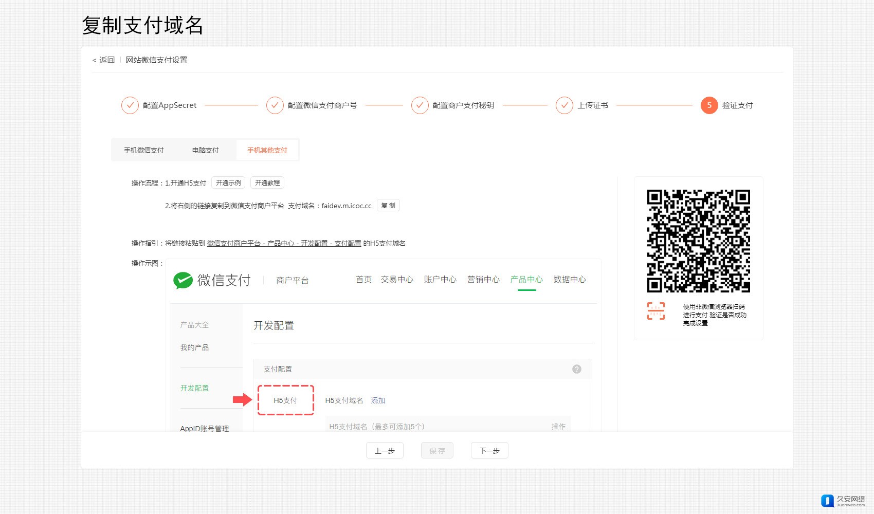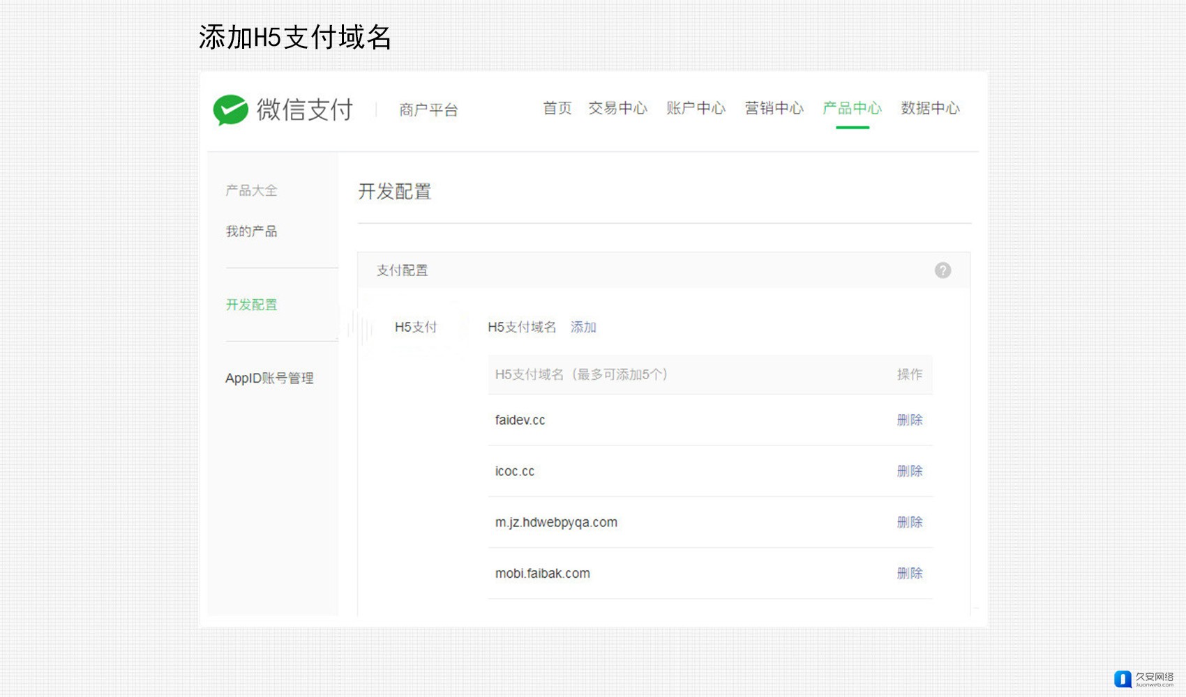 链接粘贴至【微信支付商户平台-产品中心-开发配置-支付配置】中的H5支付域名中。