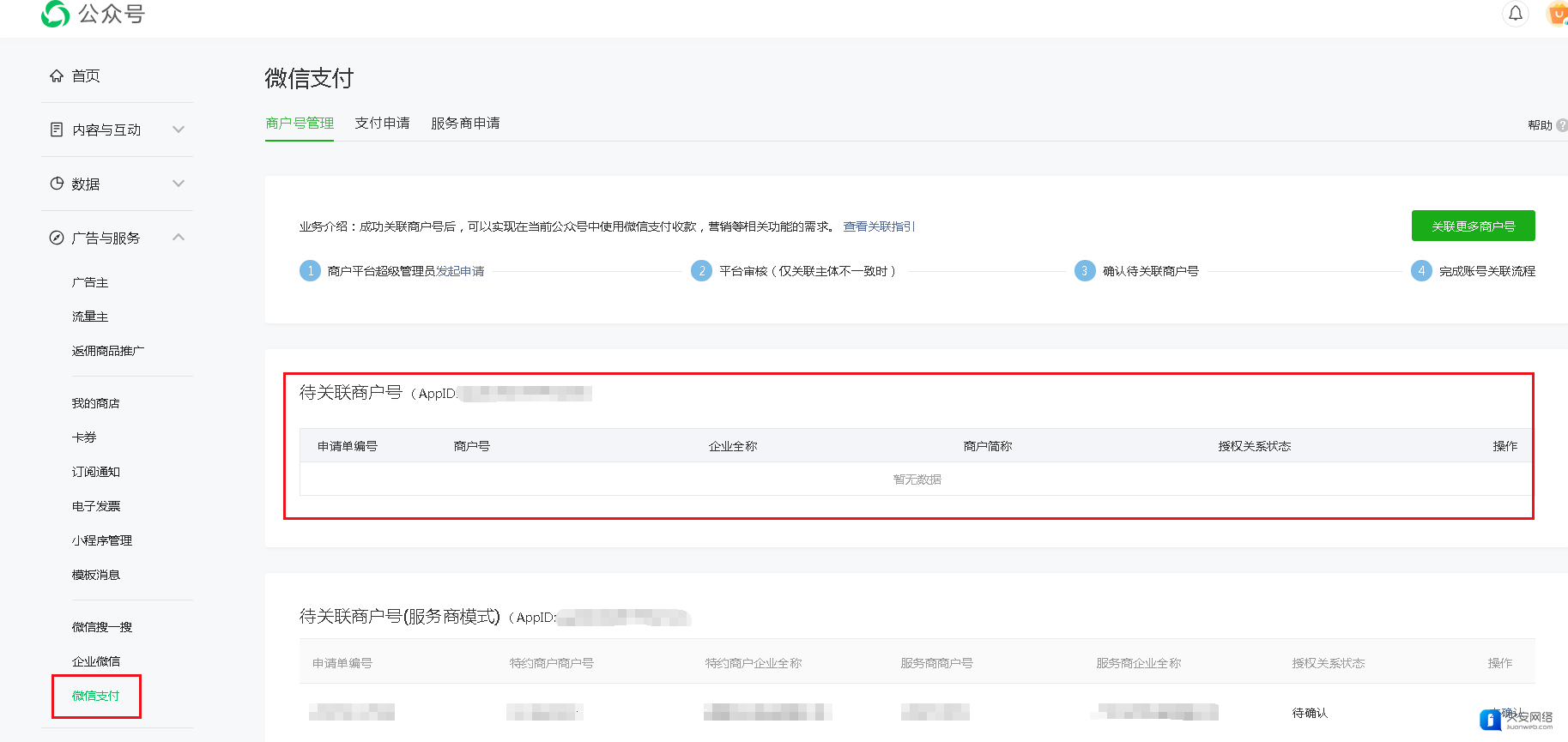 2.4 提交授权申请后,返回【微信公众号后台- 广告与服务 - 微信支付-商户号管理-待关联商户号】中进行确认。