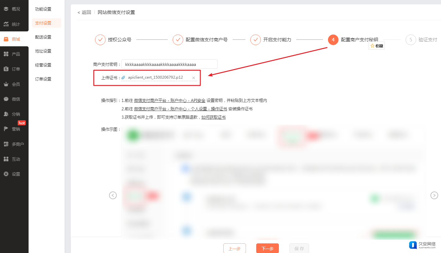 安装证书后,将证书上传至商城管理后台,如下图所示: