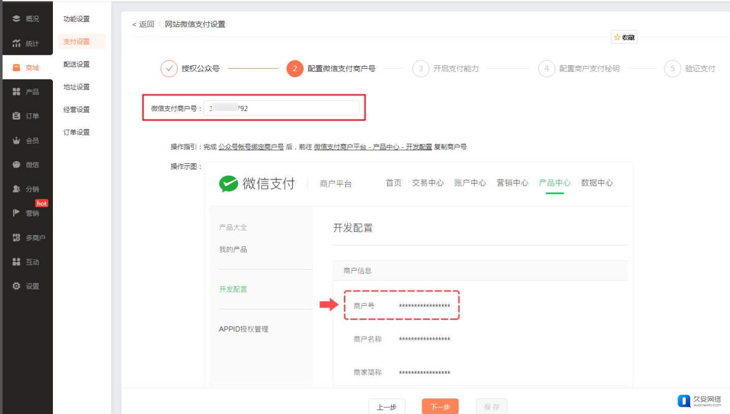 之后,将获取的微信支付商户号填写到【商城-商城-支付设置-线上支付(商家自有)-网站微信支付-微信支付商户号】处,如下图。