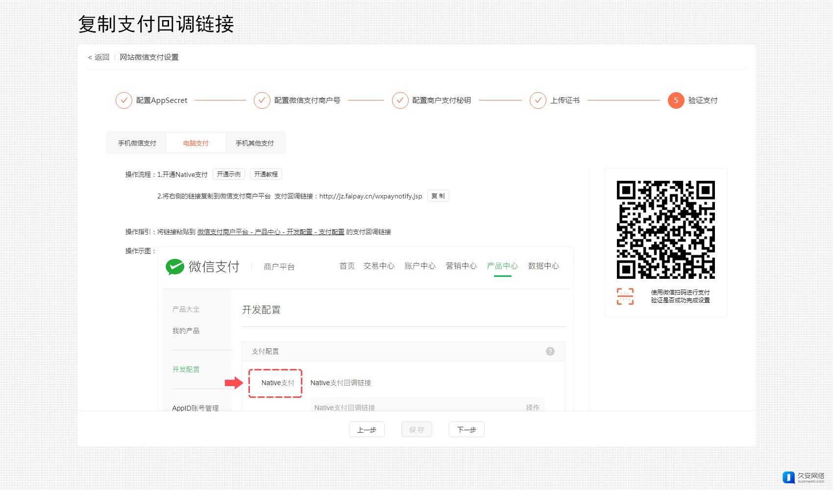 将链接粘贴至【微信支付商户平台-产品中心-开发配置-支付配置】中的Native支付中。