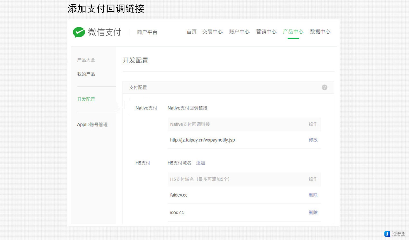 查找路径:微信支付商户平台-产品中心-开发配置