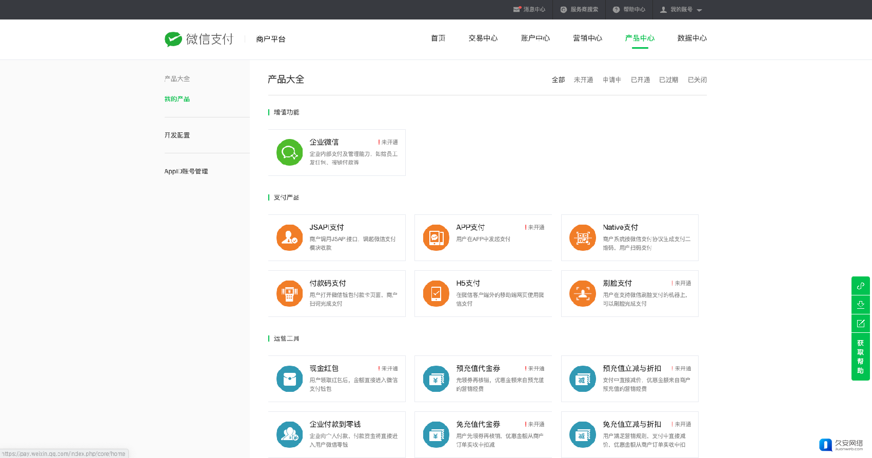3.1 进入到微信支付商户平台-产品中心-产品大全-我的产品」中开通“Native支付”