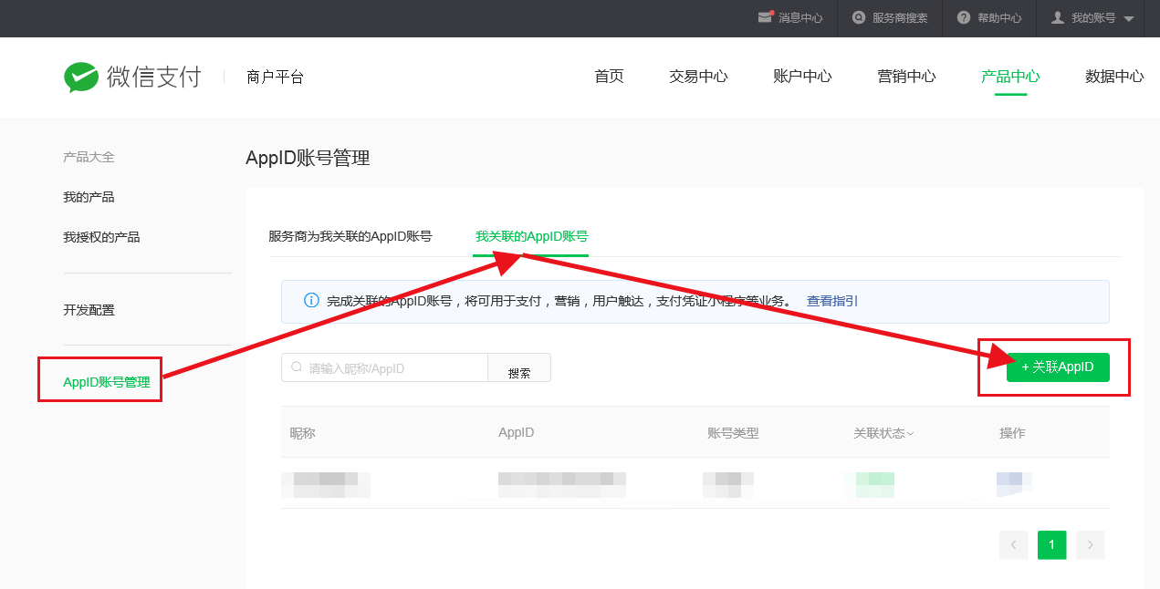 2.2 如果已拥有微信支付商户号,可登录【微信支付商户平台-产品中心-APPID账号管理】中,点击“关联APPID”,输入“已认证服务号”或“已认证订阅号(仅支持政府和媒体类型)”的APPID进行授权绑定。