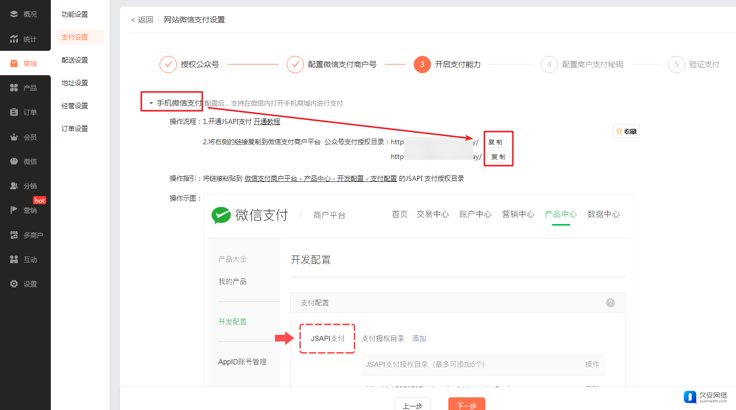 将链接粘贴至【微信支付商户平台-产品中心-开发配置-支付配置】中的JSAP支付中,随后返回商城管理后台,完成支付验证。