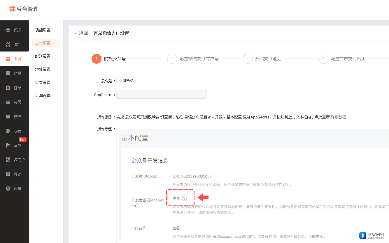 进入【商城-微信-公众号】中,将已开通微信支付功能的公众号,授权给商城。授权后,会显示公众号类型,以及公众号的Appsecret,复制Appsecret。