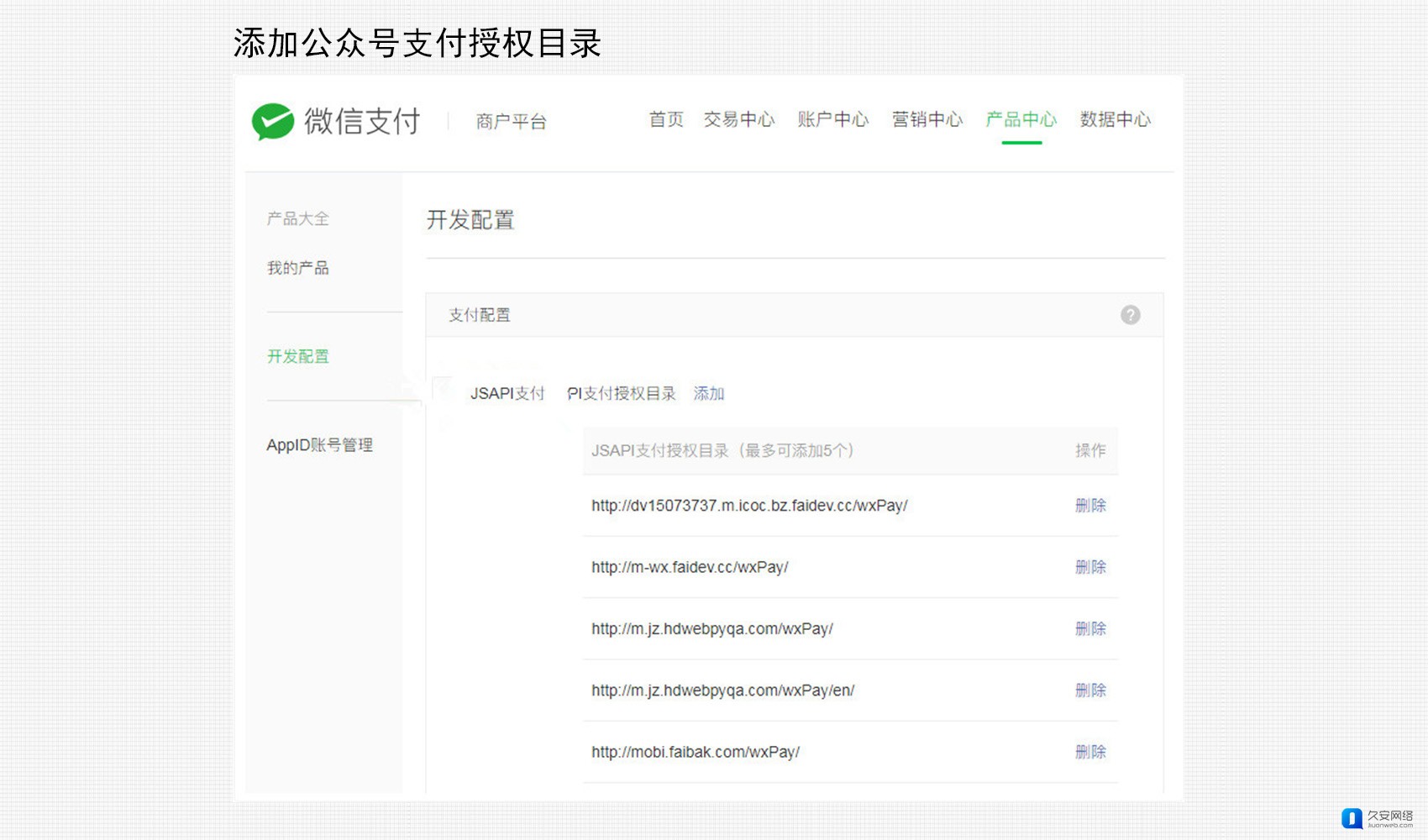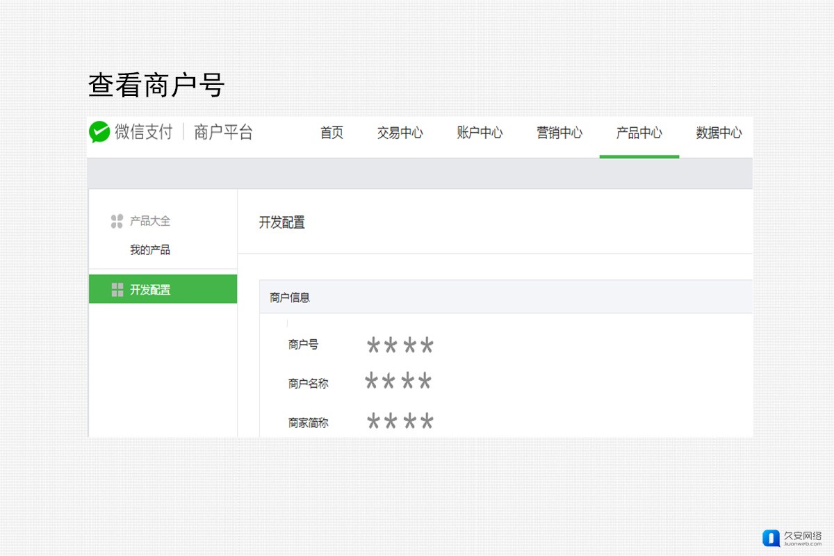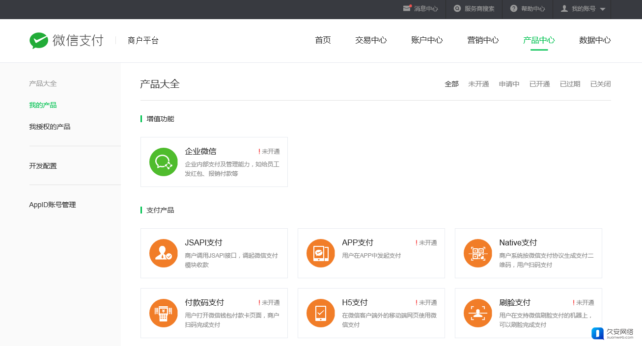3.1 进入到微信支付商户平台--产品中心--产品大全--我的产品中开通“JSAPI支付”