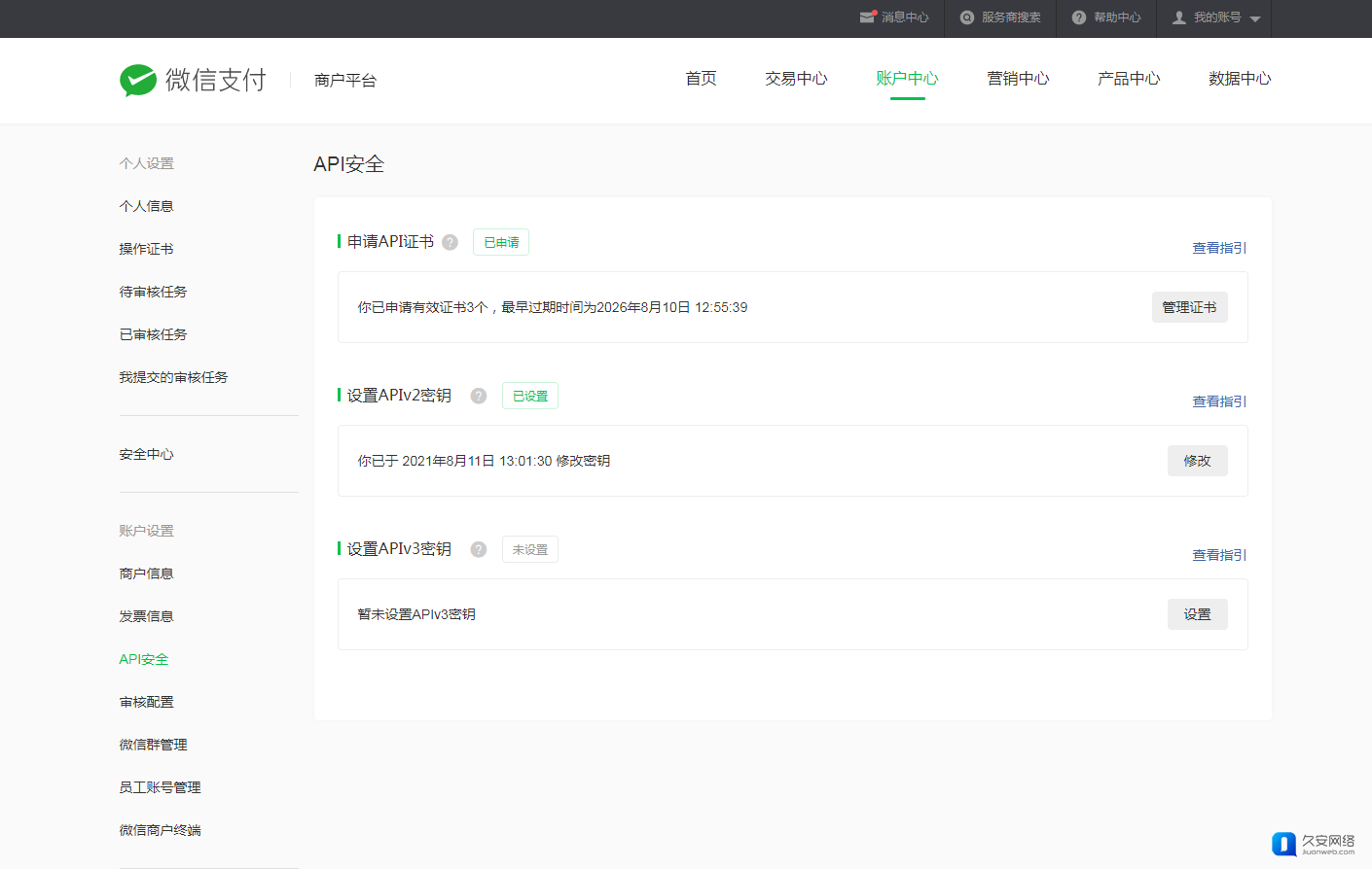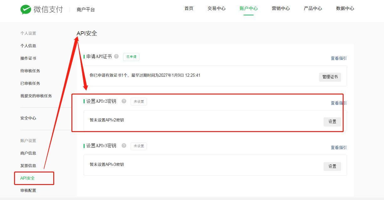 查找路径:微信支付商户平台-账户中心-账户设置-API安全