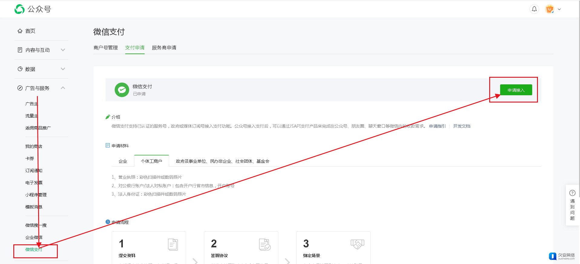 2.1 如果未拥有微信支付商户号,可登录“已认证服务号”或“已认证订阅号(仅支持政府和媒体类型)”,进入【微信公众号后台 - 广告与服务-微信支付-支付申请】中,点击“申请接入”。