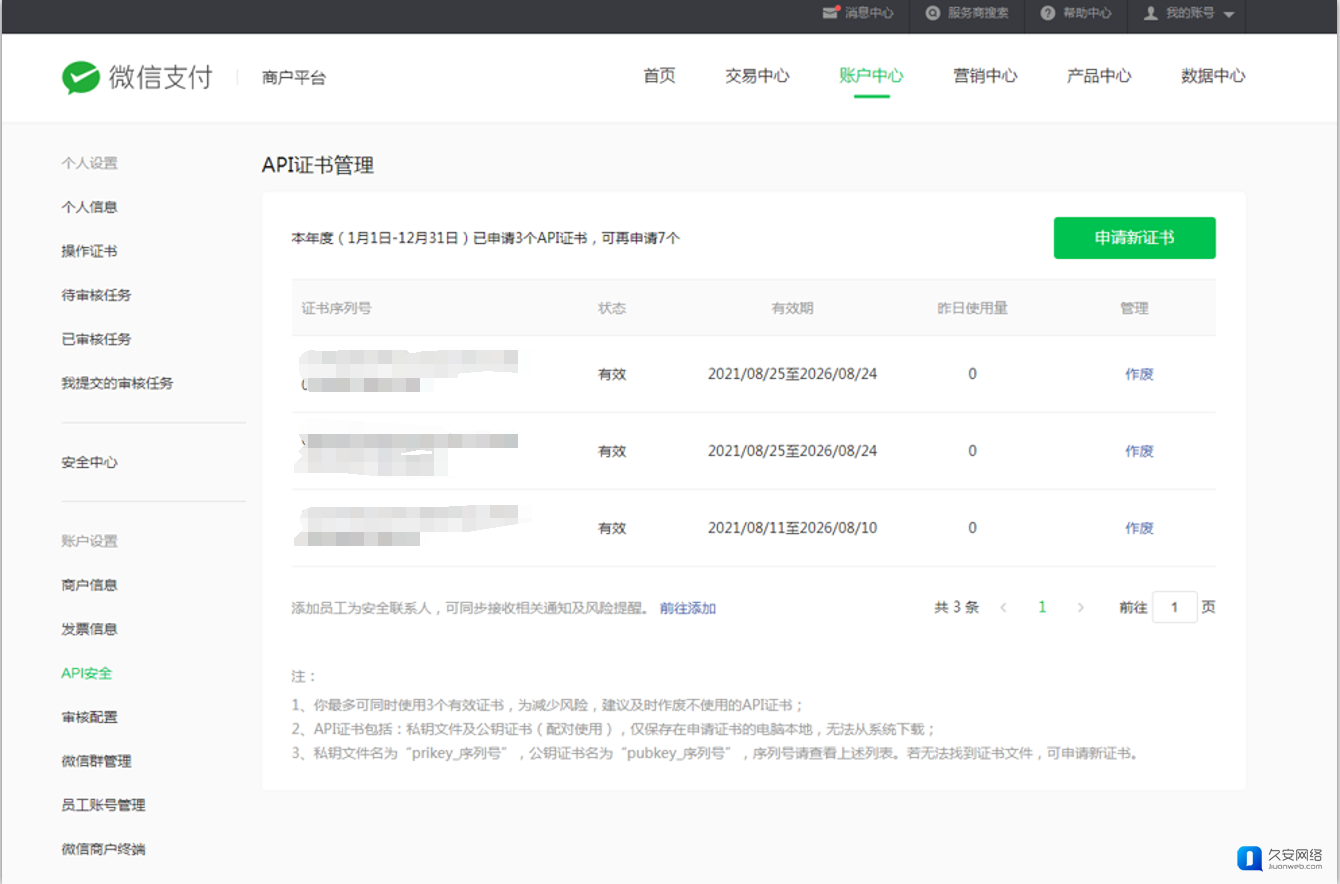 查找路径:微信支付商户平台-账户中心-账户设置-个人设置-操作证书,完成证书安装。