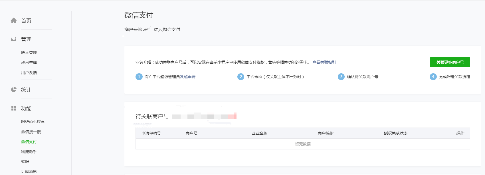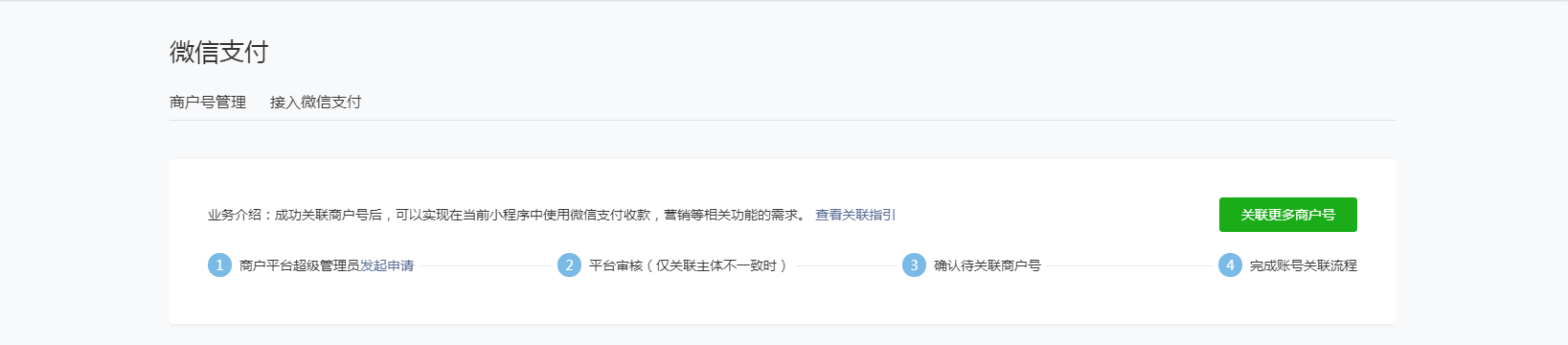 1.2 或者可进入到【微信小程序后台-微信支付-商户管理】中,点击“关联更多商户号”跳转至微信商户平台,进行APPID授权。