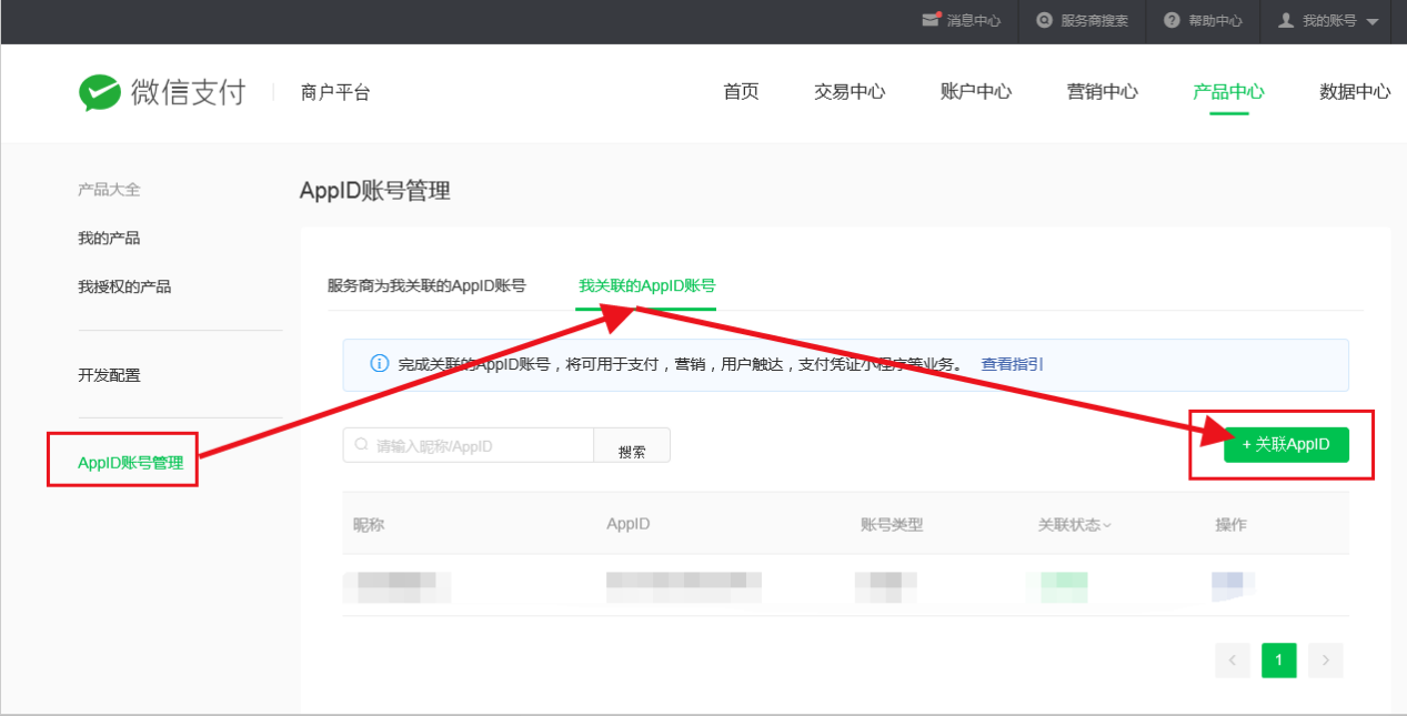 1.1 首先我们需要登录微信商户平台,进入【产品中心-APPID账号管理】,再点击添加“关联APPID”,输入自己相关的小程序APPID进行授权绑定即可(如下图一、二)。