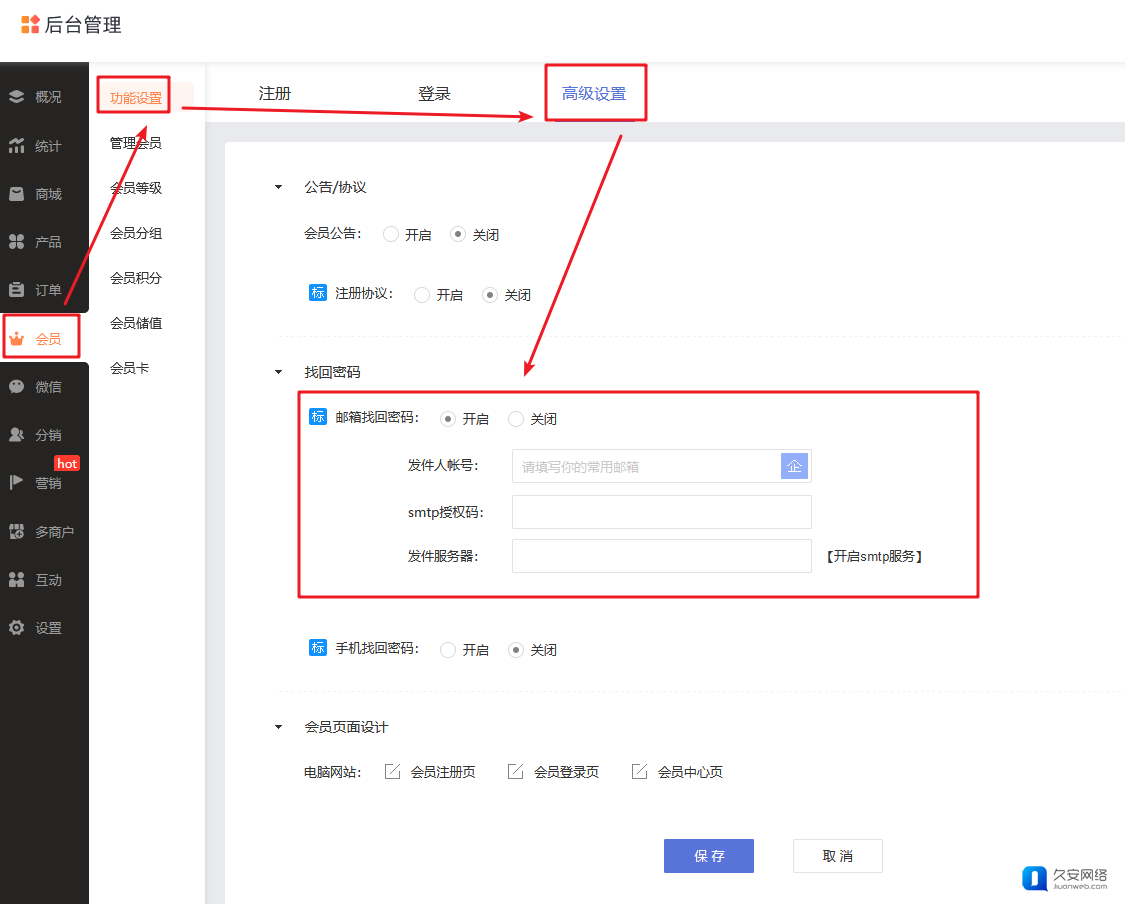 ①-由于商城中的这三个功能必须填写SMTP授权码才可以设置成功,因此建议您换一个有SMTP授权码的邮箱进行填写,如QQ邮箱、网易163邮箱等。