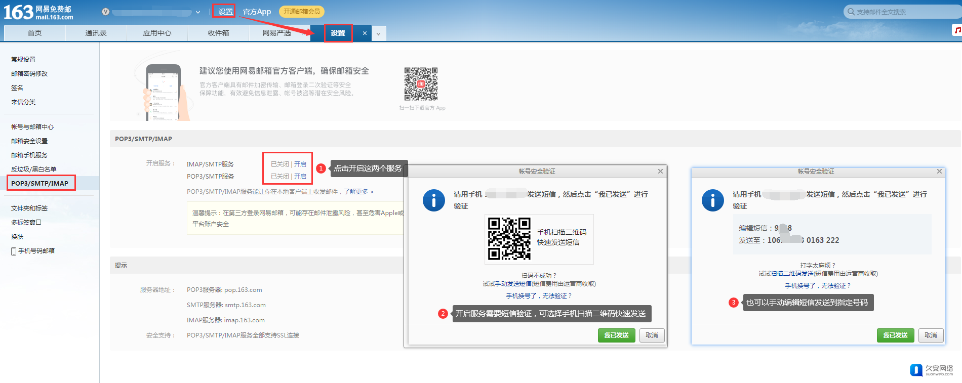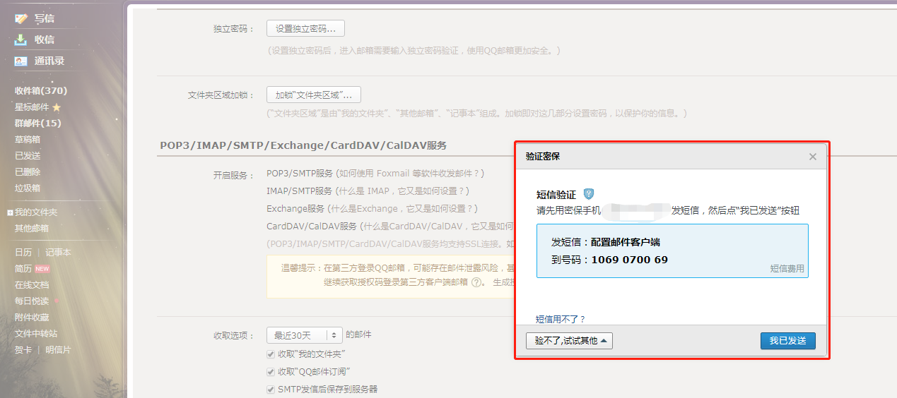 4.3 开启“POP3/SMTP服务”和“IMAP/SMTP服务”需要短信验证(两个服务都需要验证),验证完成点击【我已发送】。