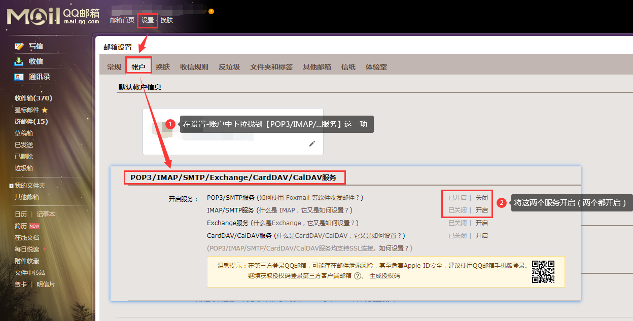 在【设置-账号】中找到【POP3/IMAP/SMTP/Exchange/CardDAV/CalDAV服务】,开启“POP3/SMTP服务”和“IMAP/SMTP服务”(两个都需要开启)。