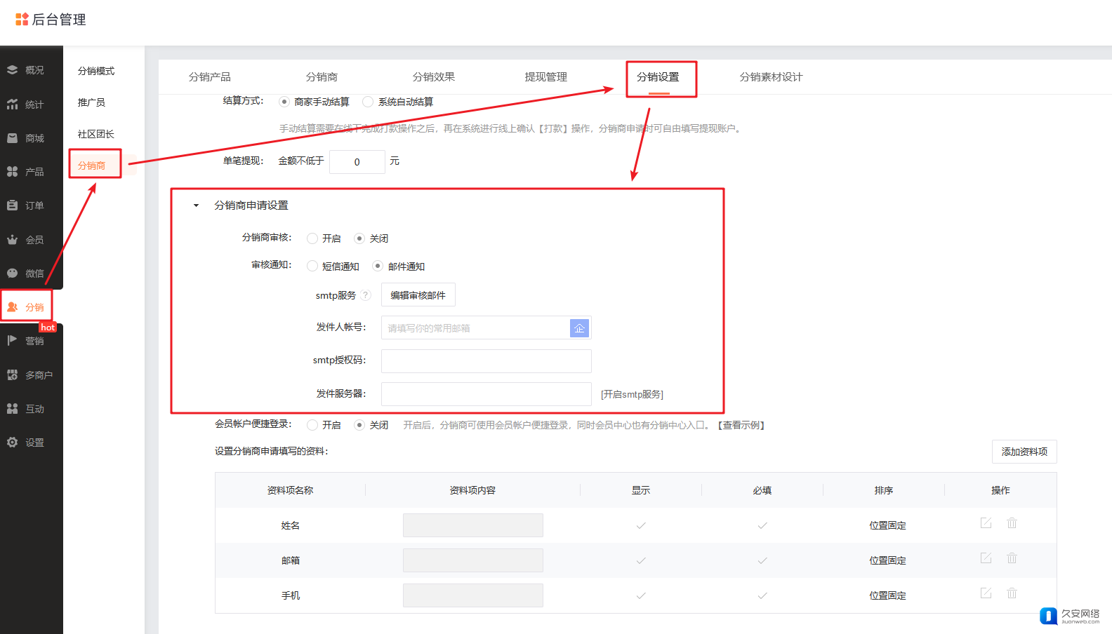 在【分销-分销商-分销设置-分销商申请设置-审核通知】中开启【邮件通知】且填写非当前企业账号的邮箱(例如qq、163邮箱等等)均需要填写smtp授权码。