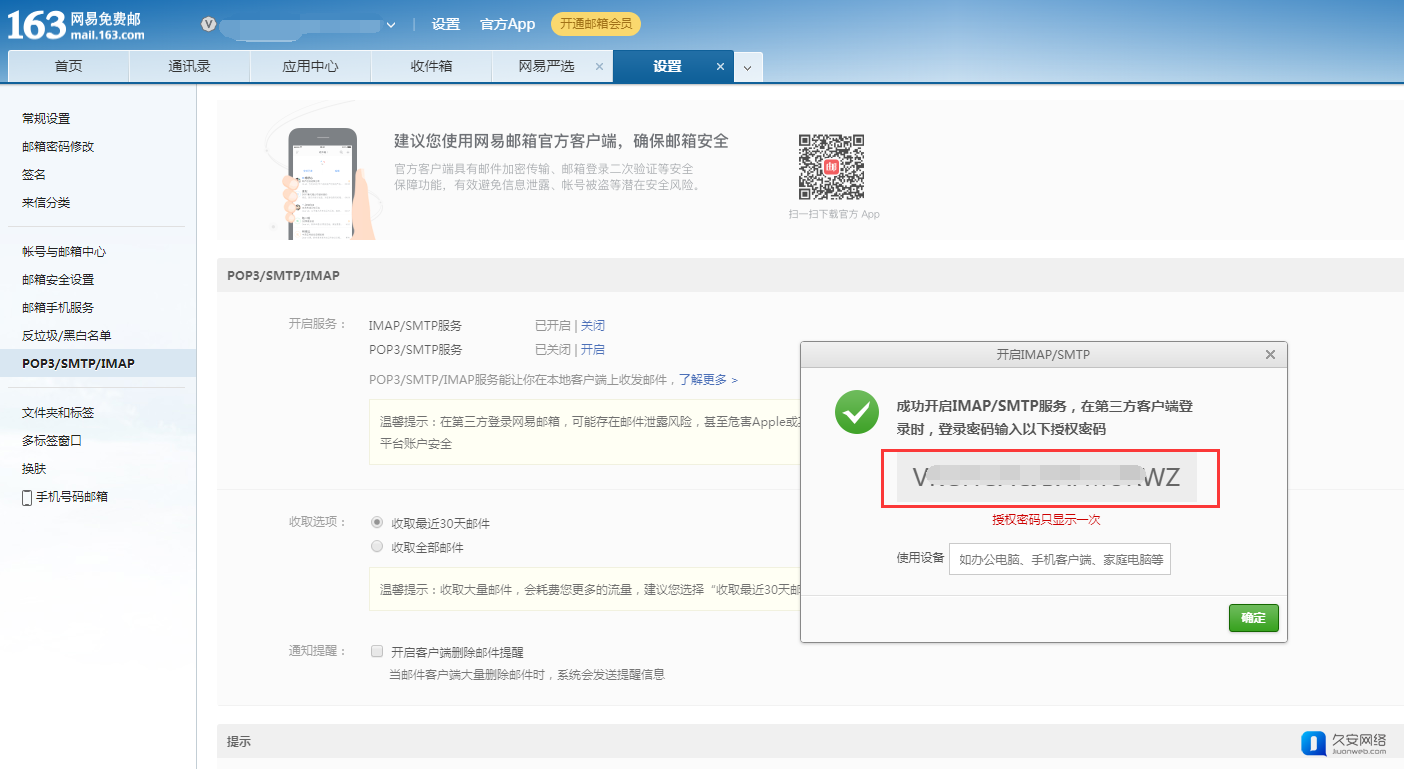 4. 163邮箱获取SMTP授权码