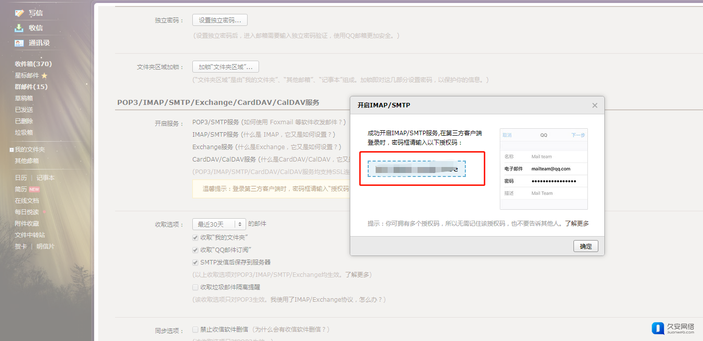 4.4 短信发送完成确认后会弹出对应SMTP授权码。“POP3/SMTP服务”和“IMAP/SMTP服务”都会有授权码,任意选择一个复制粘贴到商城需要填写位置即可。