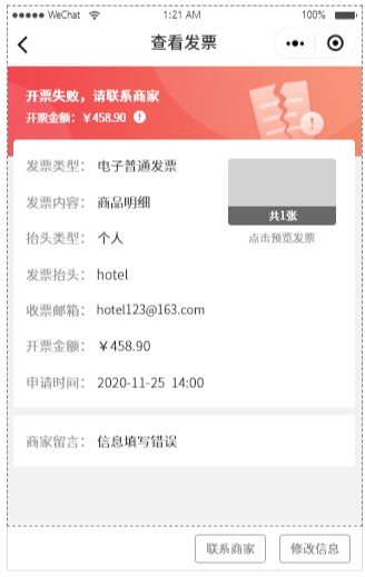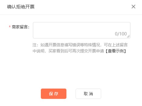 如商家想拒绝开票,可点击“拒绝”,填写商家留言,用户即可查看到商家留言。