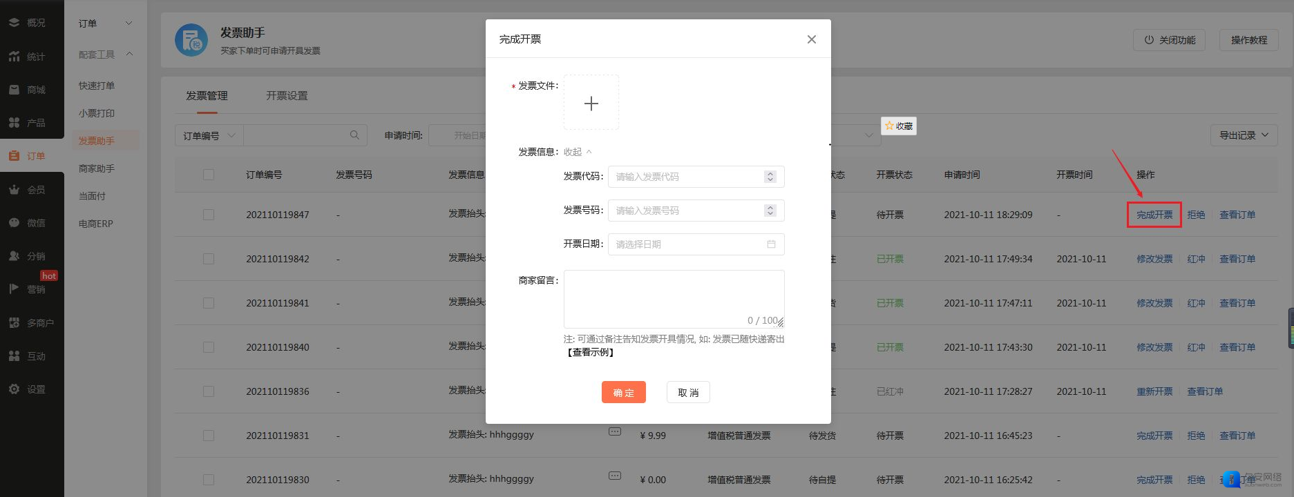 ② 买家申请开票后,该订单即同步至发票管理处。在发票管理处,商家点击操作中的“完成开票”,上传发票文件并填写发票信息,即可完成手动开票。