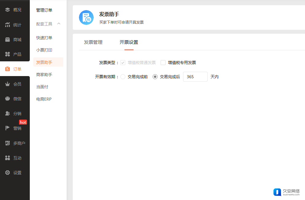 ① 商家可在商城后台开启发票助手,在开票设置里设置发票类型、开票有效期。