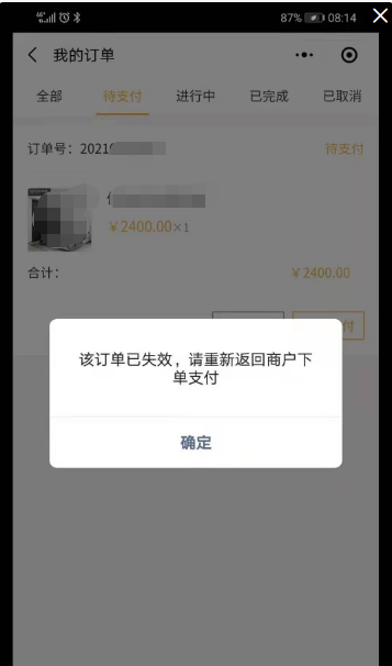 A:订单有效支付时间为5分钟,过时后如下图提示。