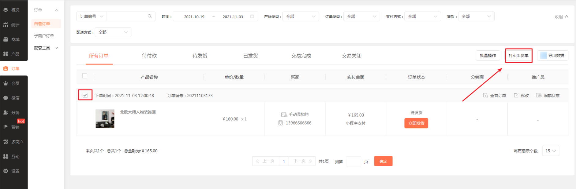 勾选需要打印的订单,点击【打印出货单】按钮可打印订单。