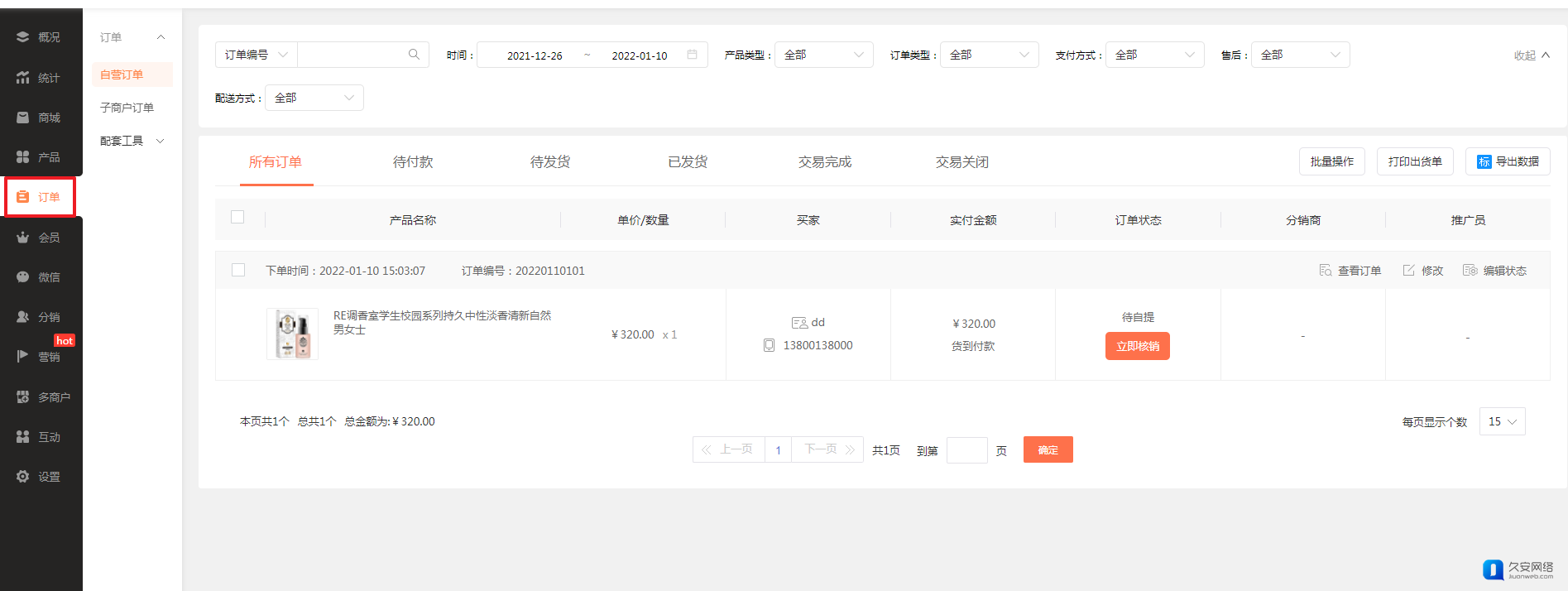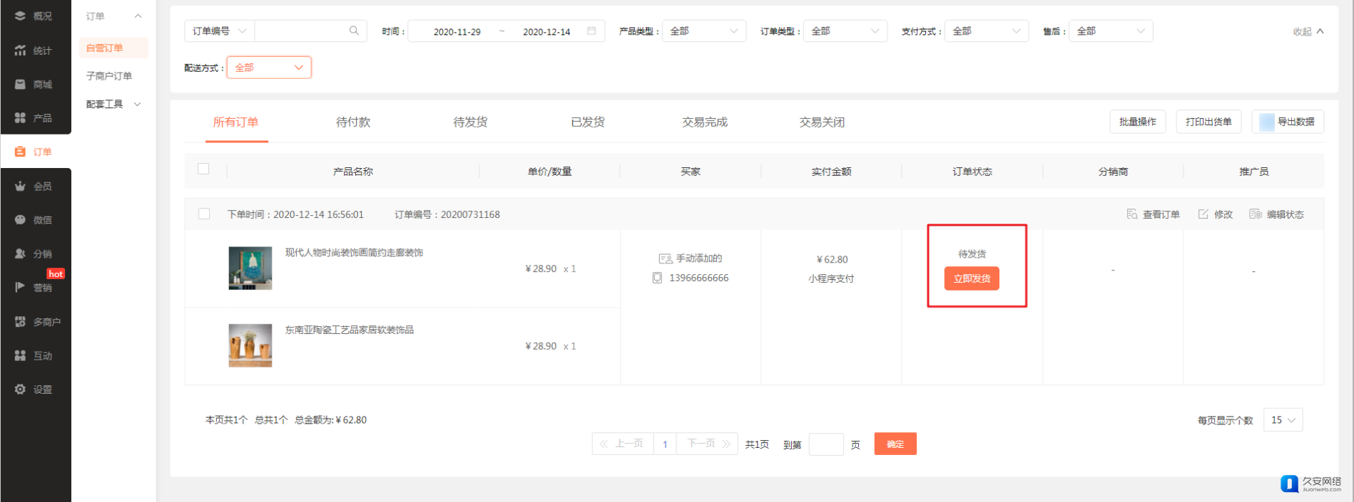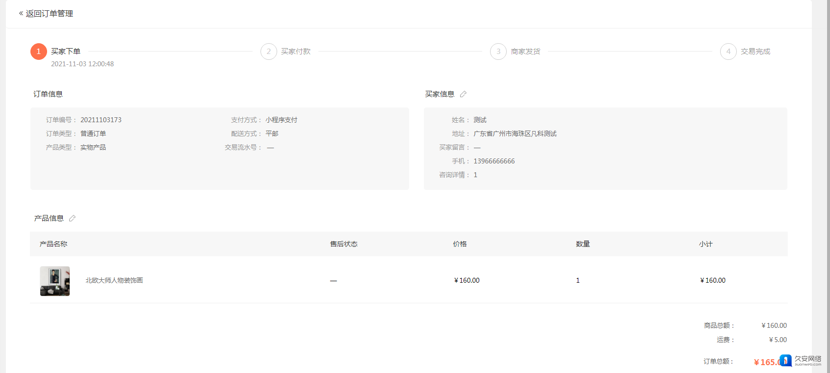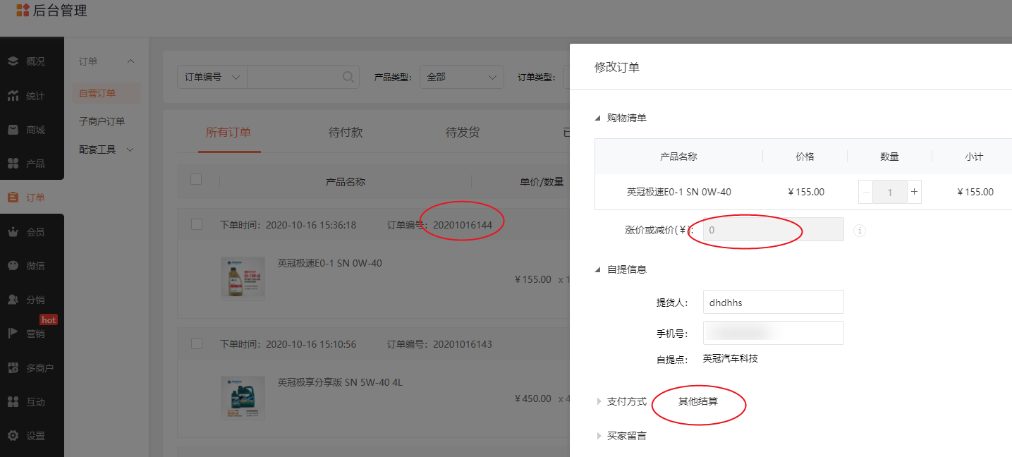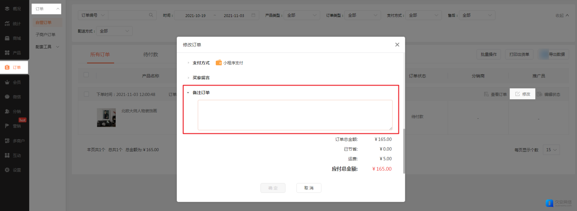 当商城用户下单后,商家可在管理后台【订单】处管理订单。包括修改订单金额、发货处理、完结订单等等操作。