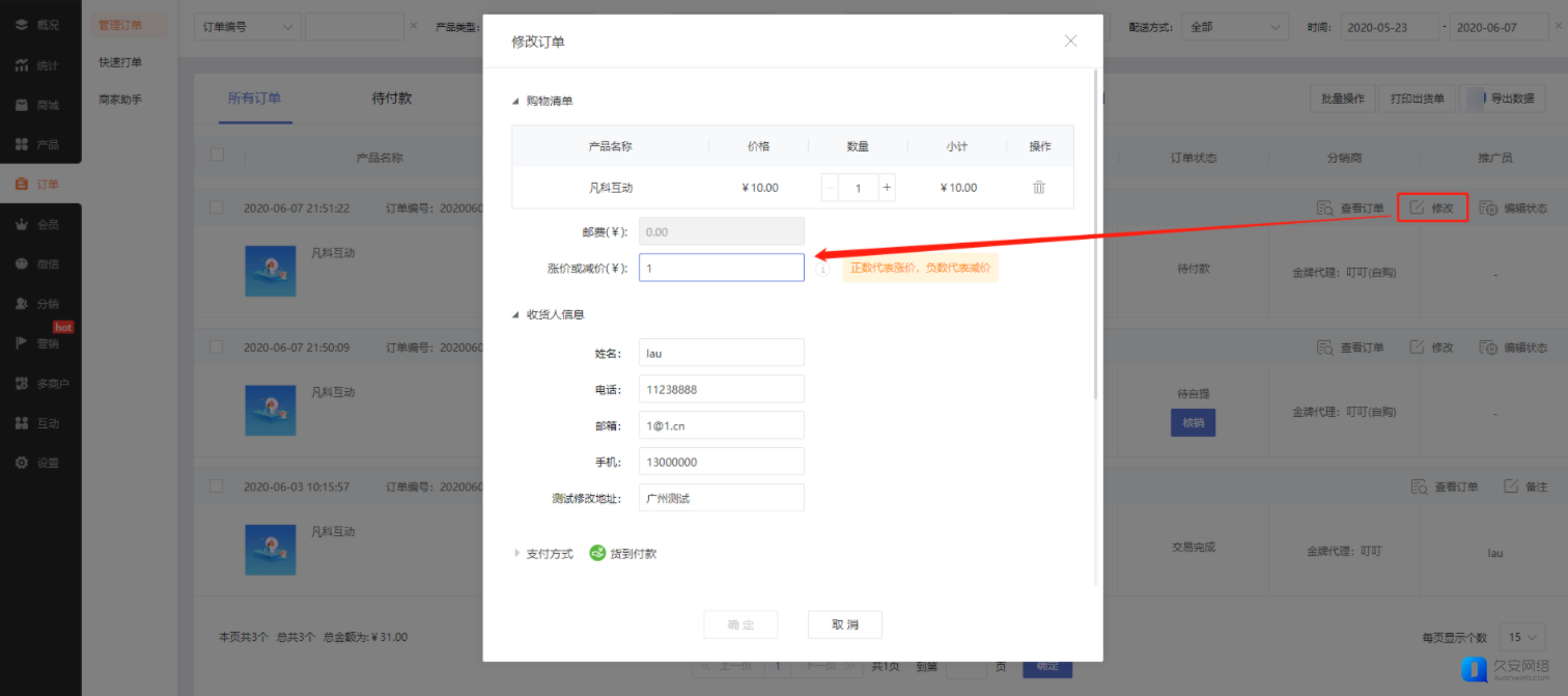 点击订单【修改】按钮,在【涨价或减价】中输入金额。(正数代表涨价,负数代表降价)