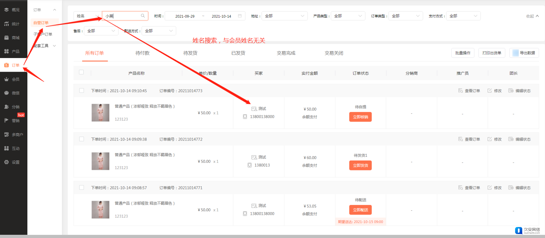 A:支持的,通过“姓名”筛选订单,匹配的是订单中快递发货收货人、到店自提提货人、同城配送收货人的姓名。注:与会员姓名无关。