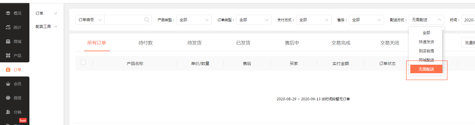Q:订单管理中可以通过配送方式筛选订单,“无需配送”是指什么订单?