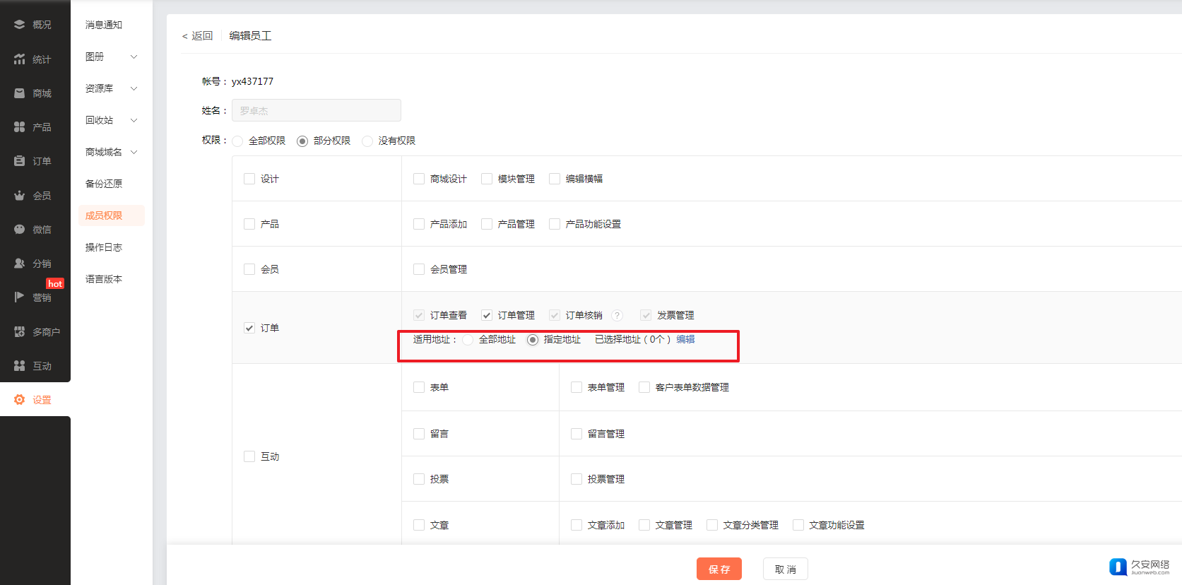 例如 :商家可设置A员工只具有广州海珠区地址订单管理权限,B员工只具有广州增城区地址订单管理权限,C员工同时具有广州海珠区、增城区地址订单管理权限。