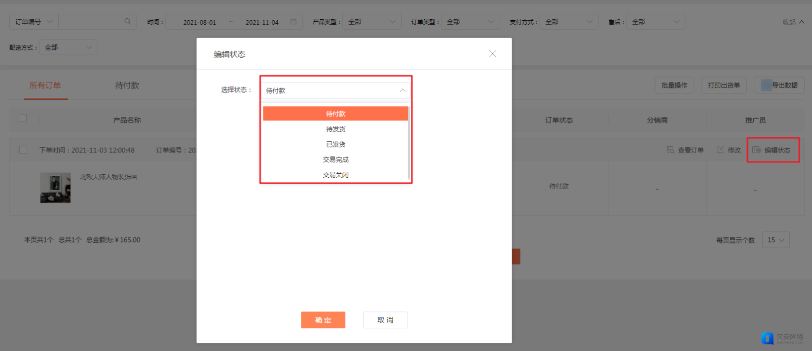 如设置商城支付方式为银行转账或其他线下付款方式,可在核对用户转账信息后点击【编辑状态】,将订单状态修改为其他进行的状态。