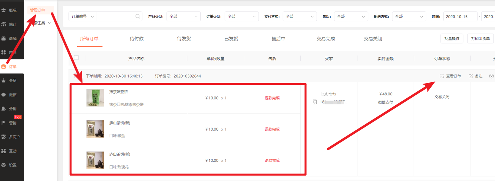 A:商城订单管理页面,一个订单最多显示三个产品,如果订单里有多个产品。需要点击【查看订单】查看。