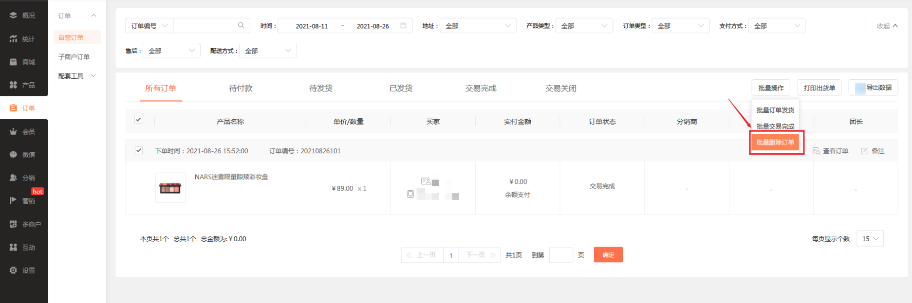 A:勾选需要删除的订单后,点击“批量操作-批量删除订单”