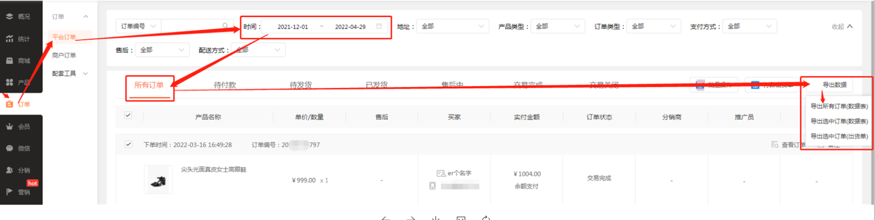 ① 可通过筛选“订单状态”列数据区分订单 交易完成/交易关闭 情况。