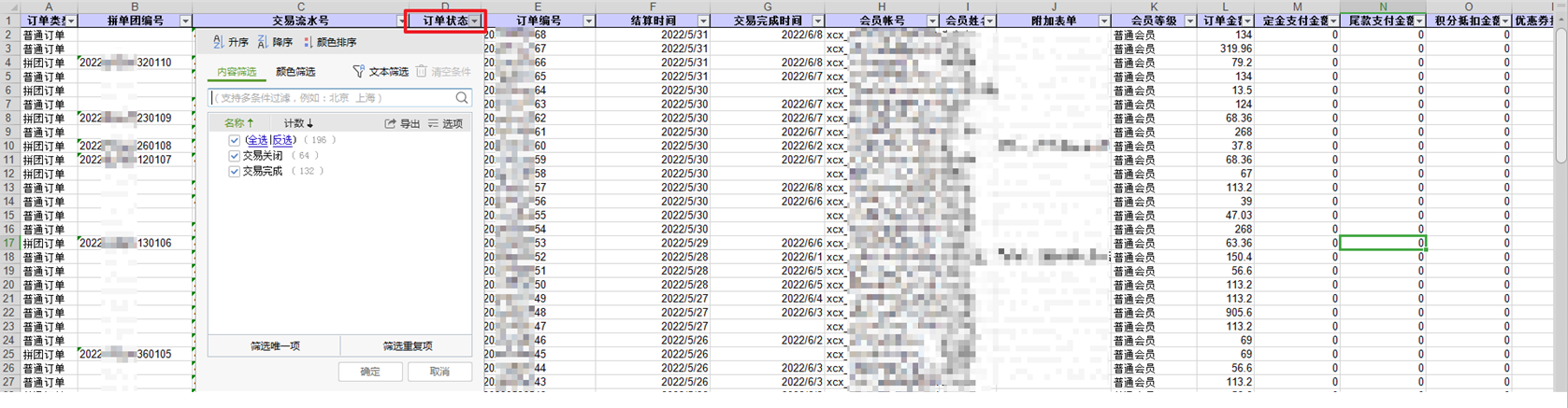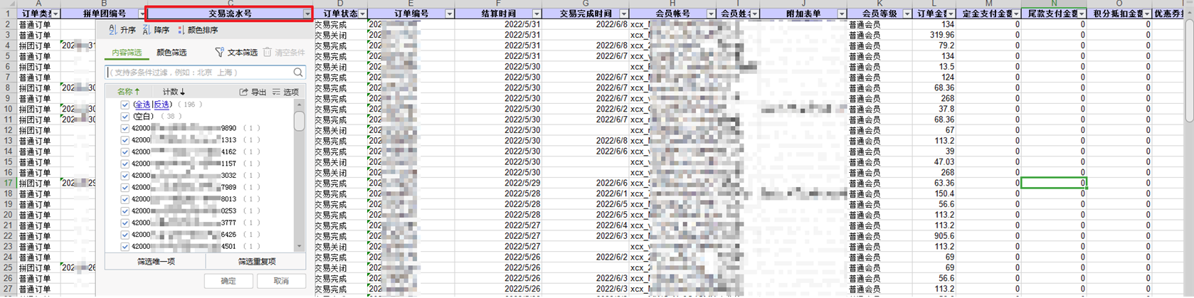 ② 可通过“交易流水号”列数据与收款平台进行核对款项关联情况,若无订单交易流水号为空,则说明订单并不是通过在线支付方式完成付款的