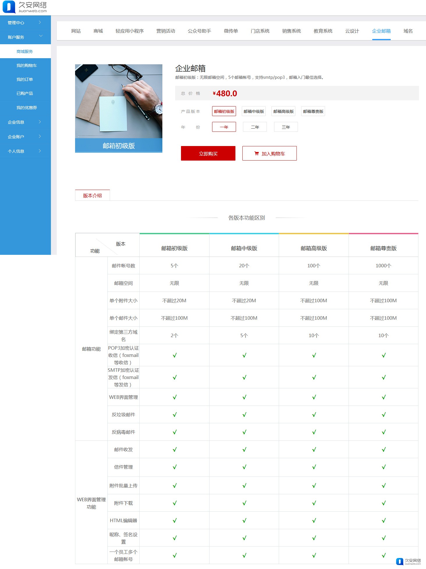 邮箱初级版 邮件帐号数 :5 个 邮箱空间:无限制