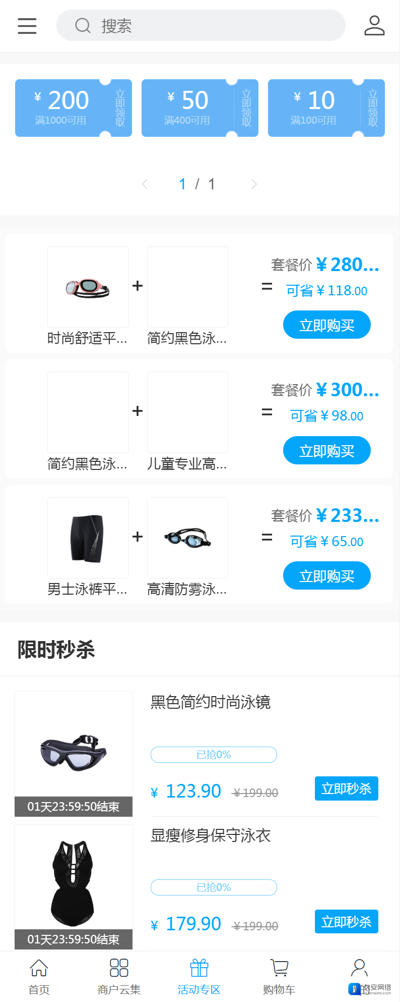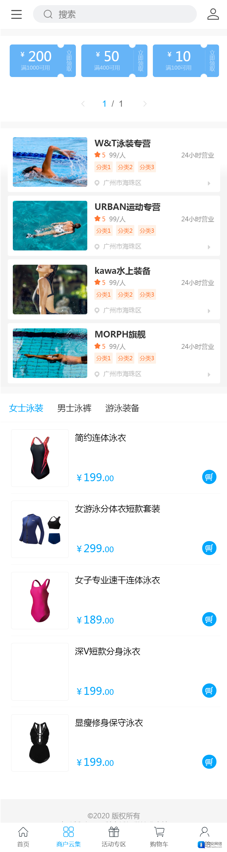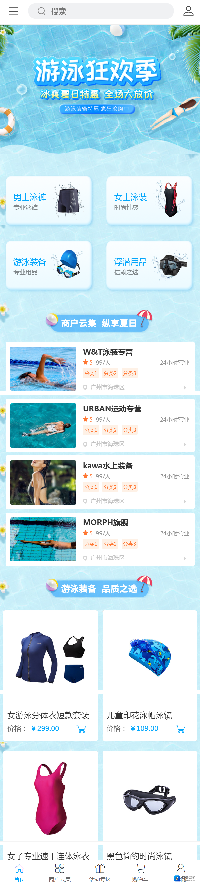 泳裤_泳帽_泳镜泳具网店网上商城模板 ,互联网泳装是一个增长较快的市场,特别是休闲、旅游产业一直蓬勃发展,对于爱度假的美女而言,泳装的更换周期越来越短,对潮流和个性化的款式越来越高,她们愿意尝试新品。第二,泳装属于高利润商品,其运费和生产成本低,使得可以实现免邮寄送以及让利。第三是泳装在各社交媒体和数字平台曝光率频繁,网红穿搭对粉丝的影响巨大。最后比起商场门店,女性群体更喜欢在家试穿泳衣,所以泳装更适合网购。
