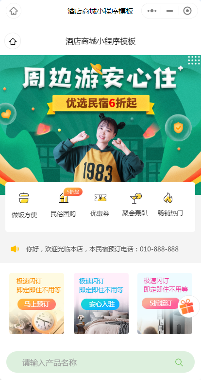 客户打开酒店小程序的目的非常明确,就是要订房间,因此小程序首页无需太多功能,把搜索功能、热门房型、房型分类等优先显示,方便客户快速订房。
